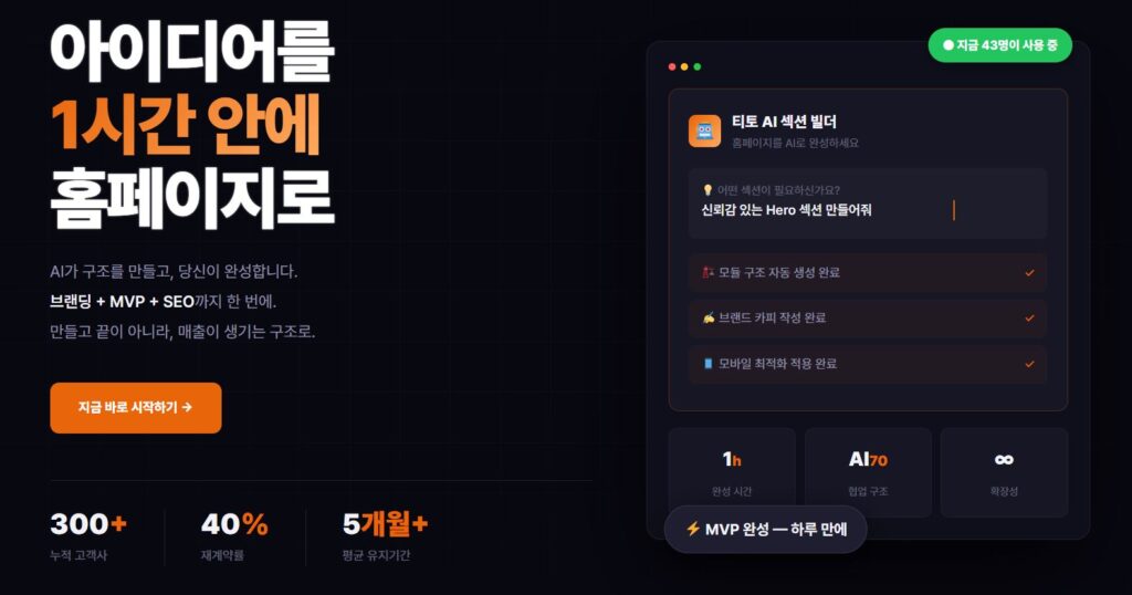 티토 DX5060은 홈페이지를 단순히 제작하는 툴이 아니라 만들고 운영까지 돕는 솔루션입니다. 사업소개서만 넣으면 구글에서 검색이 잘되는 구조로 홈페이지를 기획해줘요. 메인화면, 회사소개, 서비스(제품)소개, 제품상세페이지를 뚝딱 만들어 줍니다. AI활용으로 시스템 자동화가 되어 있어, 디지털이 막막한 5060 사장님도 쉽게 시작할 수 있어요. 만들면 뭐해요? 수정을 못하는데… 걱정마세요. 각 섹션별로 코딩챗봇이 있어요. 미리보기 기능이 있어 수정도 쉽습니다. 설명하면 AI가 대신 코드를 바꿔주니까, 노코드 방식으로 누구나 가능해요.