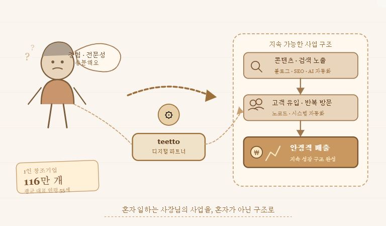 혼자 일하는 데에는 익숙하지만, 혼자서 모든 것을 지속적으로 운영하는 것은 다른 문제예요. 특히 디지털 영역에서는 꾸준함이 성과를 만듭니다. 콘텐츠가 쌓이고, 검색 노출이 늘어나고, 고객 유입이 반복되면서 비로소 매출 구조가 만들어지는 거죠.