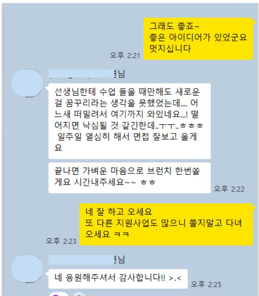 “끝나면 가벼운 마음으로 브런치 한번 쏠게요. 시간내주세요 ㅎㅎ”